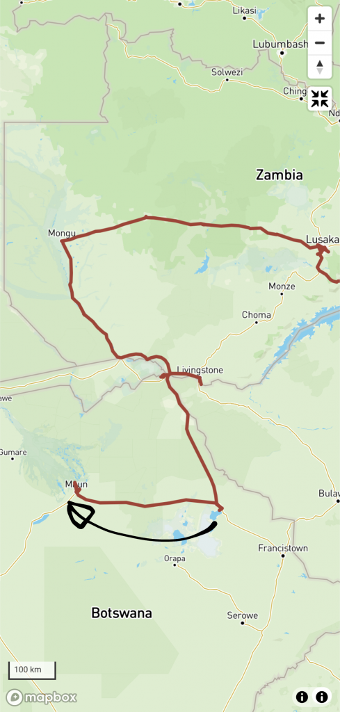 In the morning we wake up in a puddle as the bottom of our tent is apparently not waterproof anymore. We grumbly pack up the sodden sleeping bags and start the final push towards Maun. Somehow the weather manages to be too hot, too sunny, too humid and too headwindy all at once. By the time we reach the town we are pretty worn out. To top it all off Ben gets a puncture three kilometers before the end and we have to stop every 500m to pump up the tire.