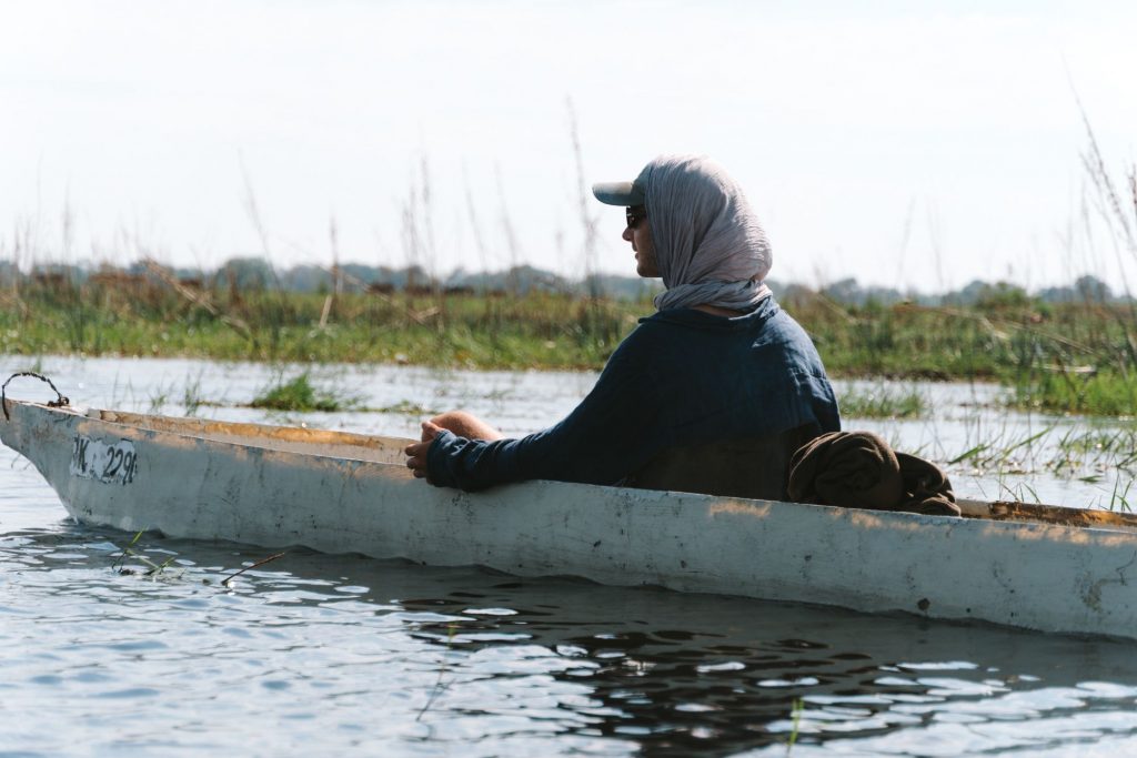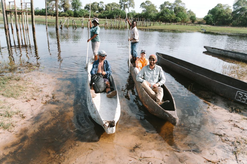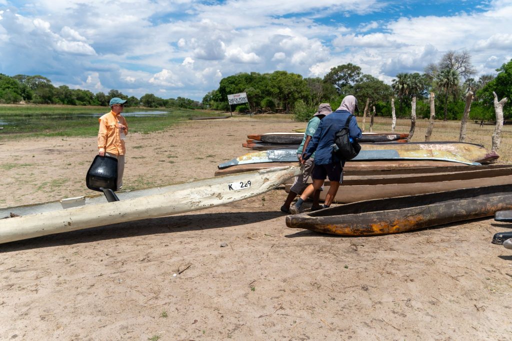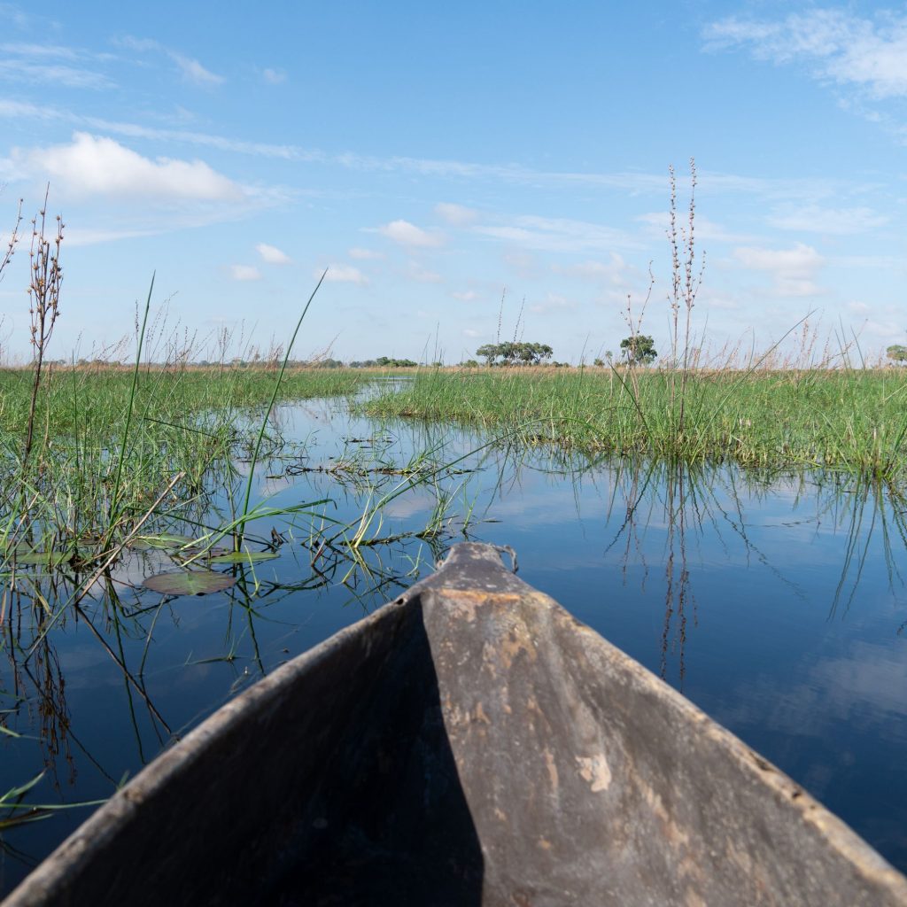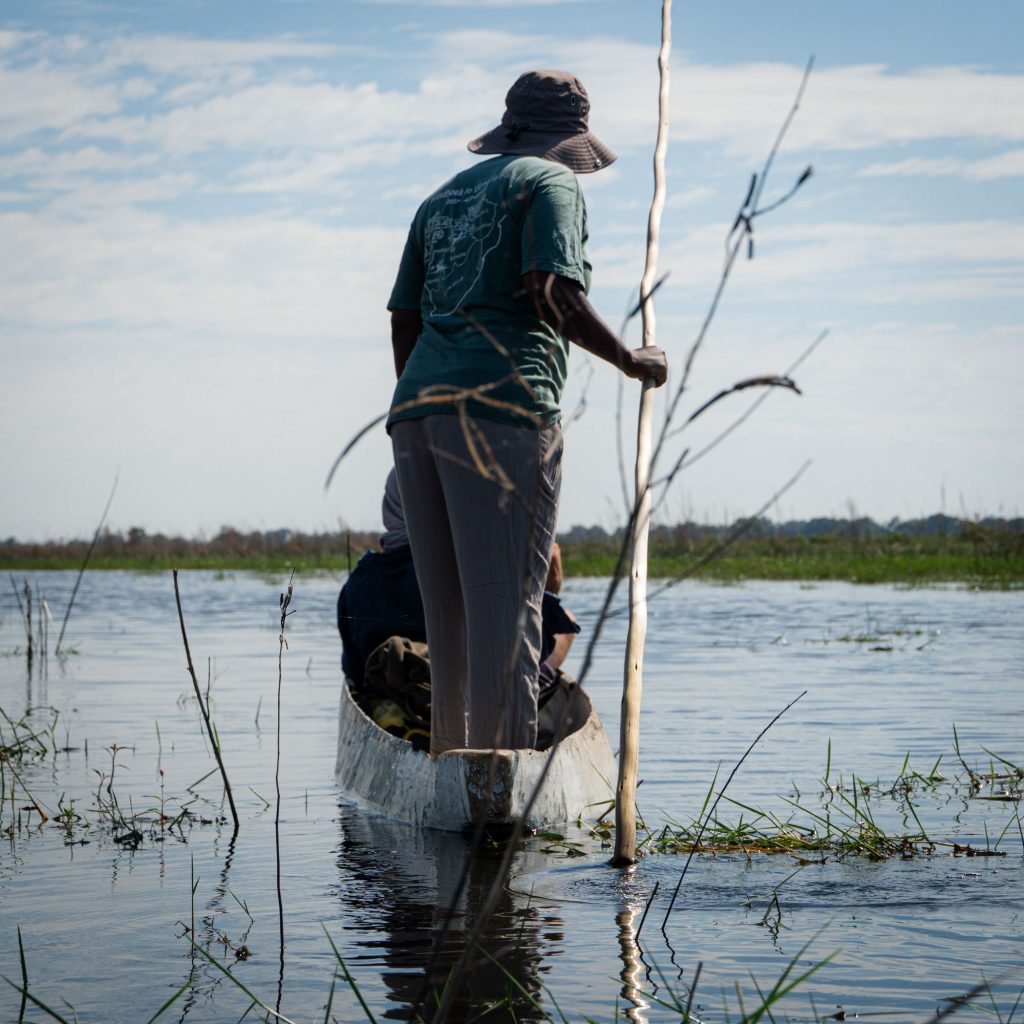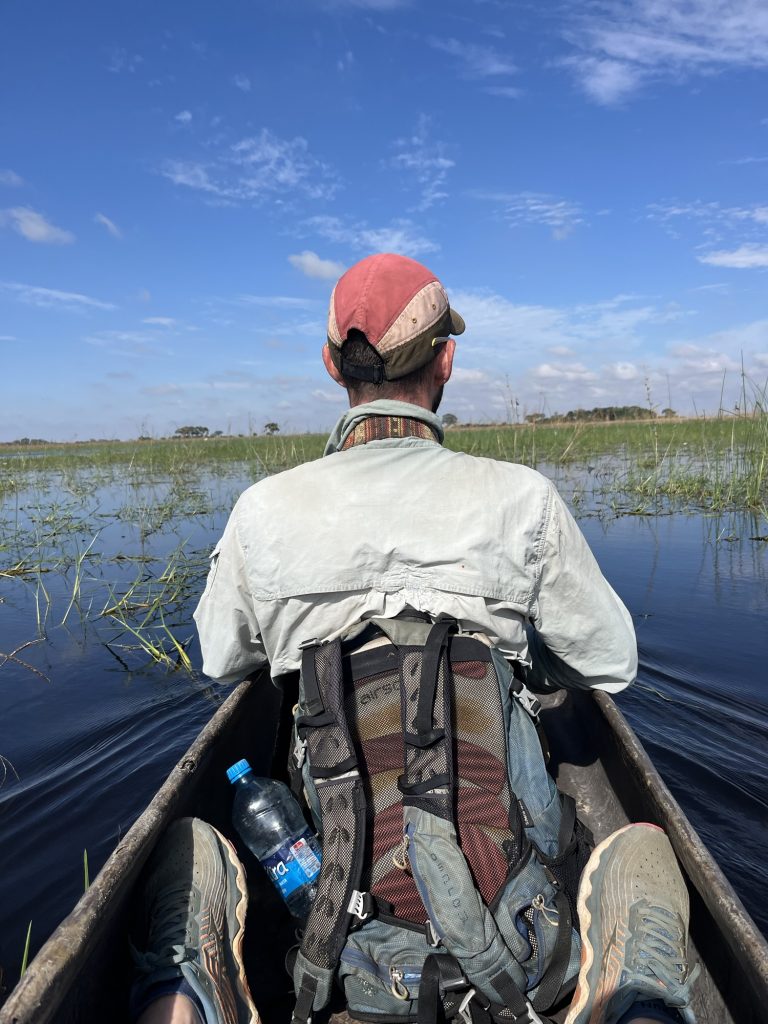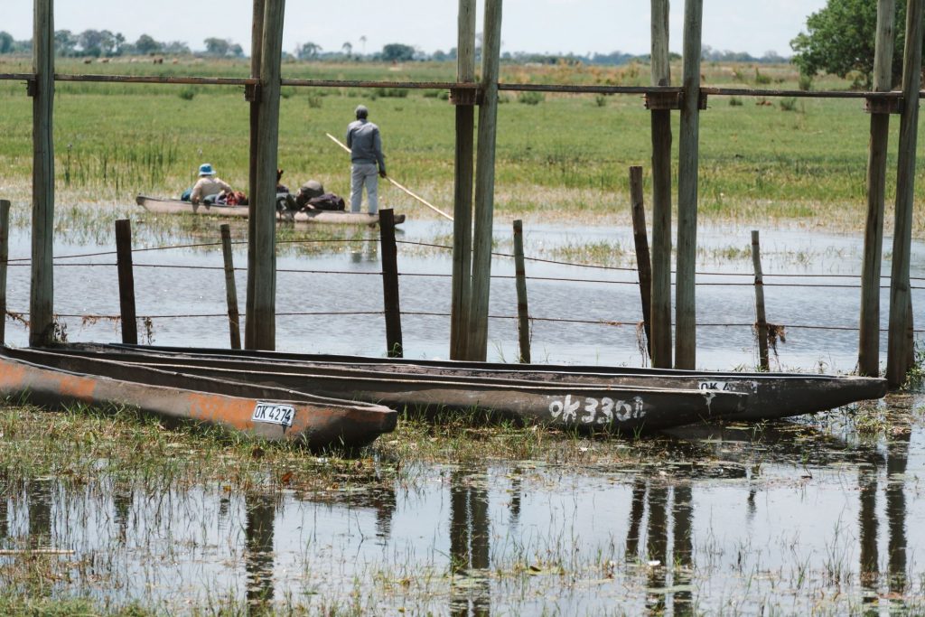 In the morning we head out into the hinterland of Maun to one of the boat landing sites of the Okavango delta. We’re greeted by our two polers who will maneuver the easily tippable dugout canoes (called mokoros) through the meandering waterways. We just sit back and try not to move too much as the mokoros glide silently through the shallows. We float past reeds and water lillies; bugs are flitting across the channels and blacksmith lapwings squawk at us for invading their territory.