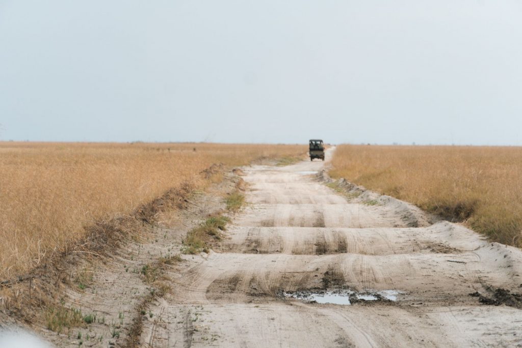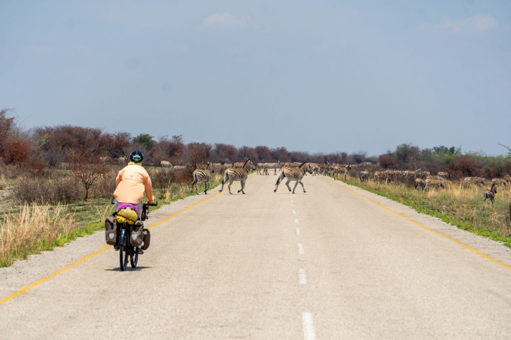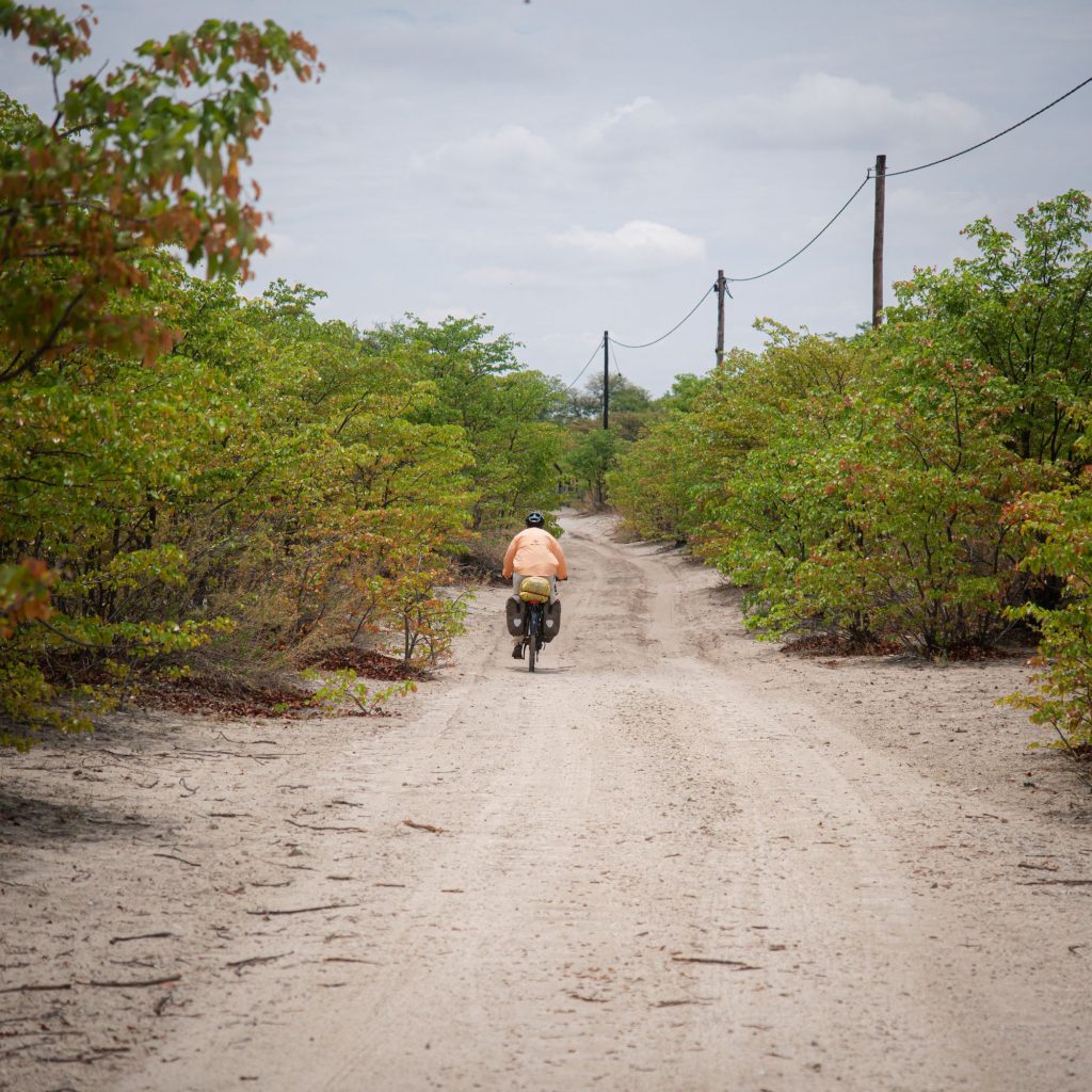 Too early for our taste we are back in the saddle, pedaling towards the town of Maun and the Okavango delta. Supposedly we should have tailwind for this entire section. Yet over the next few days it seems to be coming from every which way in varying levels of intensity. But the views more than make up for the hardship. We cycle alongside hundreds of zebra, startle a few elephants, spot giraffes in the distance and an ostrich next to the road.