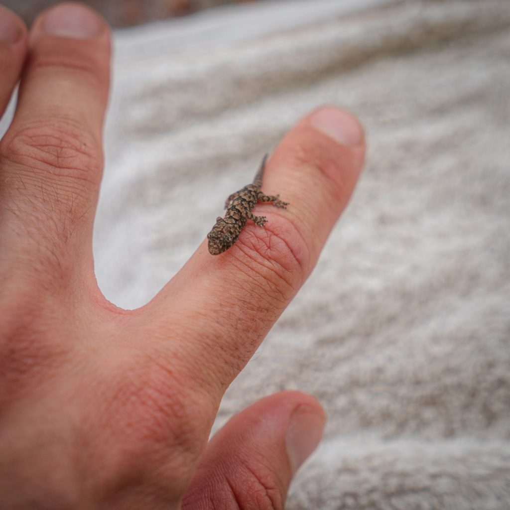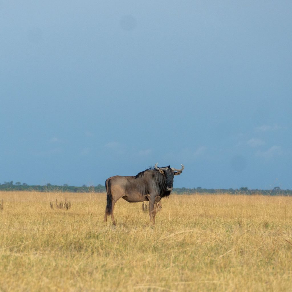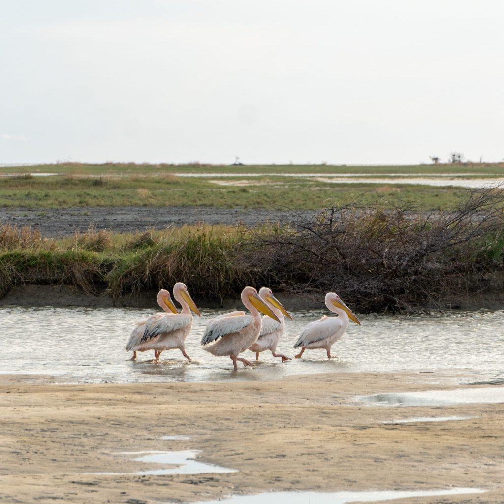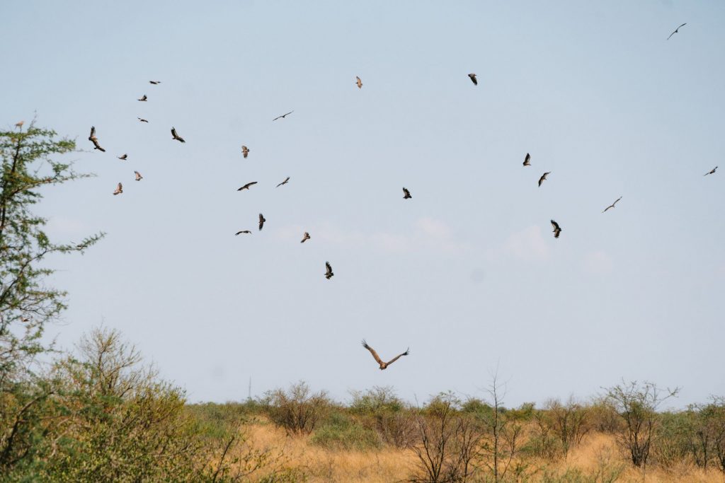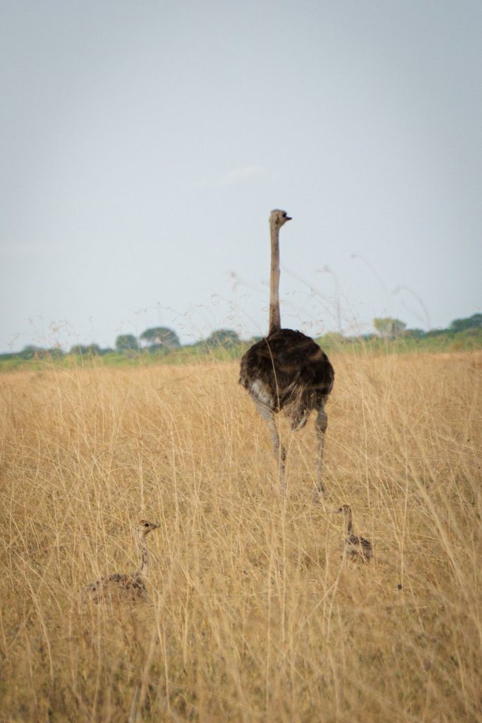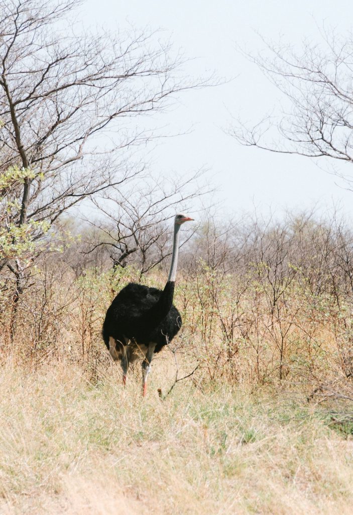 It’s amazing to watch someone so at ease with strangers. On the drive he keeps everyone entertained with his rendition of the Lion King soundtrack. Once inside the sanctuary silence descends onto the vehicle. The grassy plains with herds of wildebeest are set off sharply against the dark sky. We roam around the sandy tracks, finding a mother hyena and her pups, wild ostriches and their chicks, a flock of pelicans and other new birds for our collection.