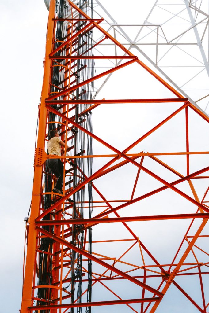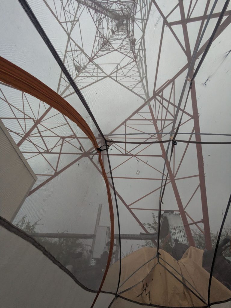 The next day we aren’t quite as lucky in our choice of accommodation. After an exhausting day of 125km (the biggest distance yet) we pull into another transmission tower yard. We set up the tent on a little concrete platform underneath the tower so that it doesn’t get too sandy when the rain inevitably comes. Then we timidly climb up a few rungs of the ladder to get a better view of the surroundings. In the night we are jolted awake by a thunderstorm.