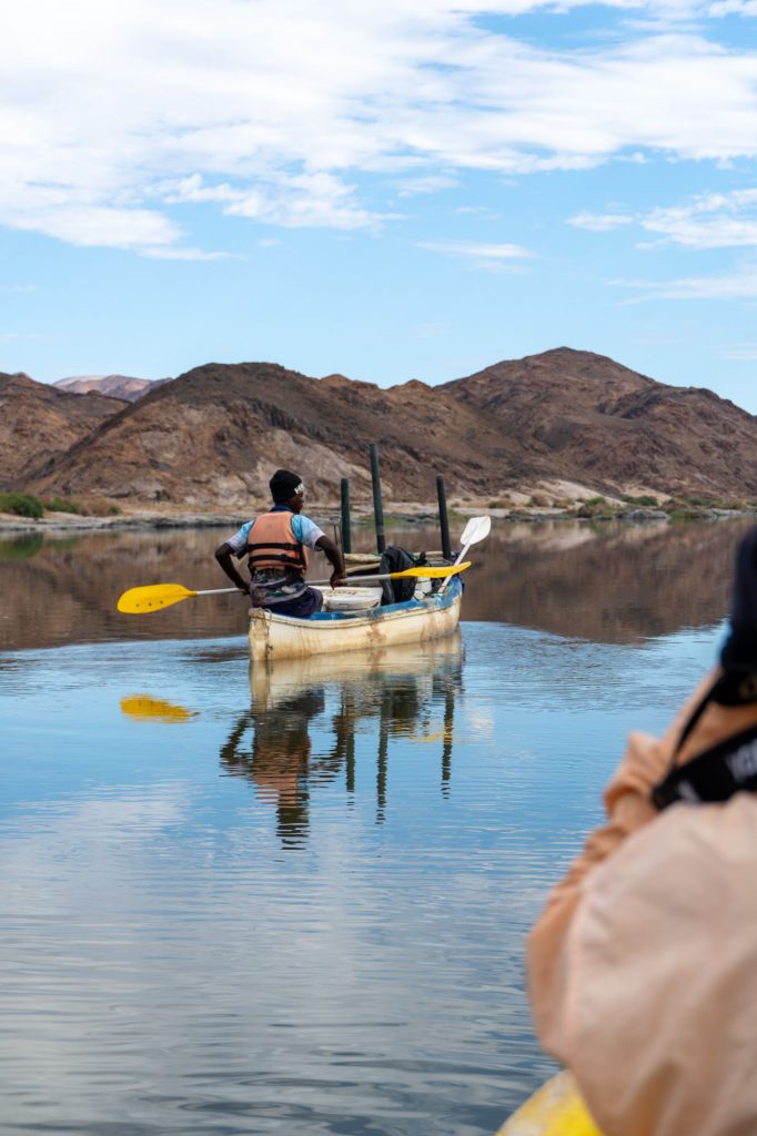 Zach and Romanus wade out to right the canoe and reassure our bruised egos that this happens all the time. We nod along sulkily. Lina makes Ben swear that he won’t turn on his camera until we are leaving Namibia and we get back in the boat. When we reach the day’s campsite we – this time – go for a voluntary swim. The fish have sensed our weakness of spirit and come to nibble at our legs. At night we gather round the fire and Romanus scatters fluoride rocks into the flames. They emit a beautiful green glow and make us flinch as they crackle and explode from the heat.