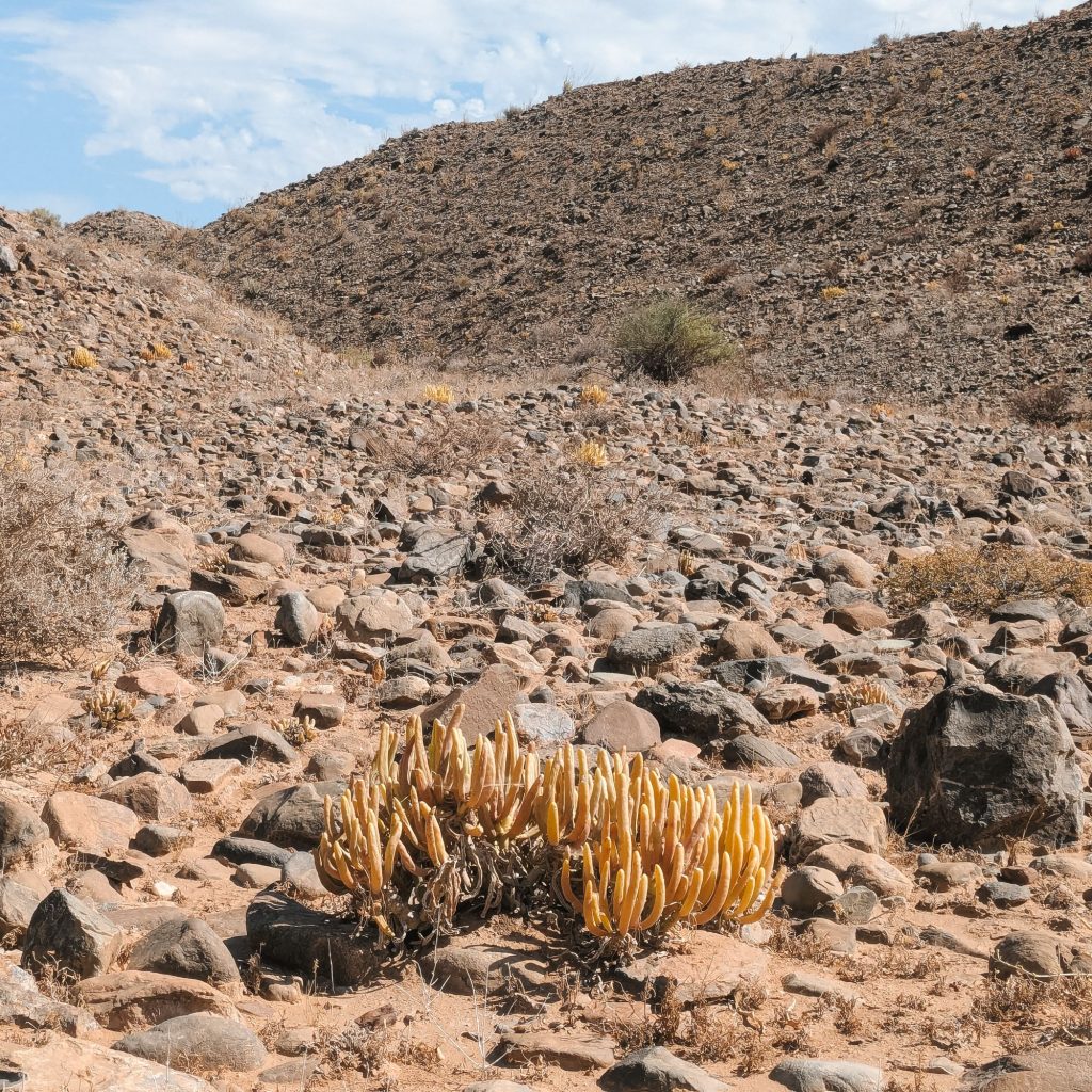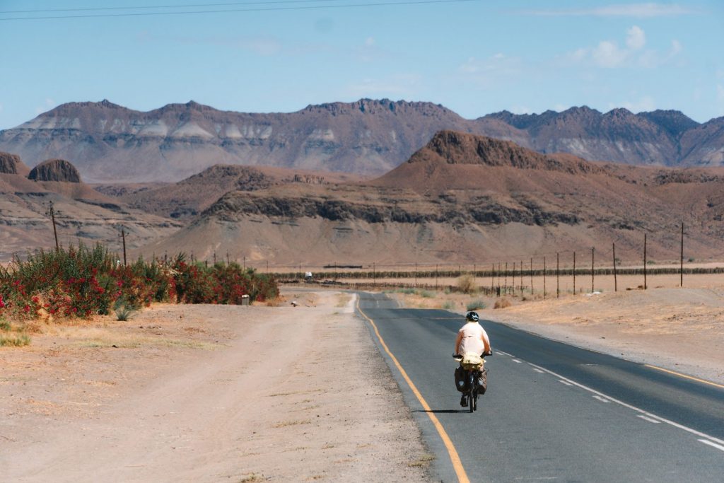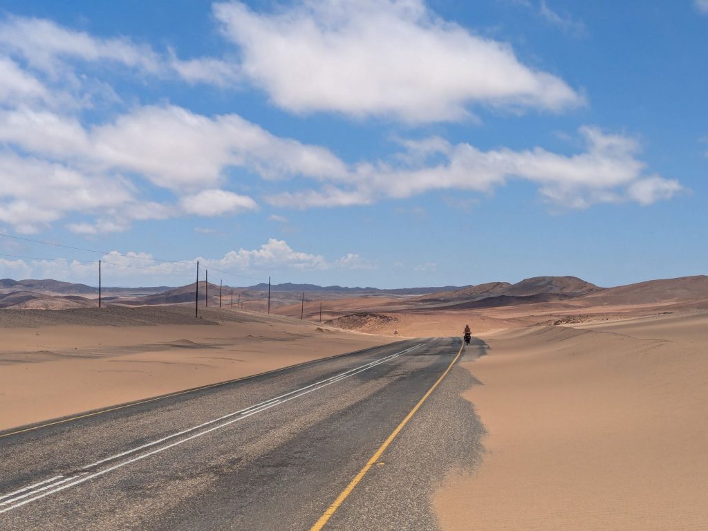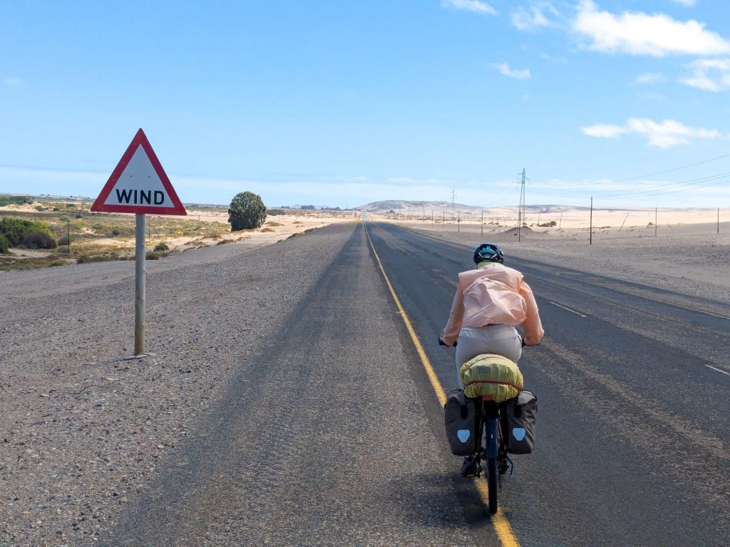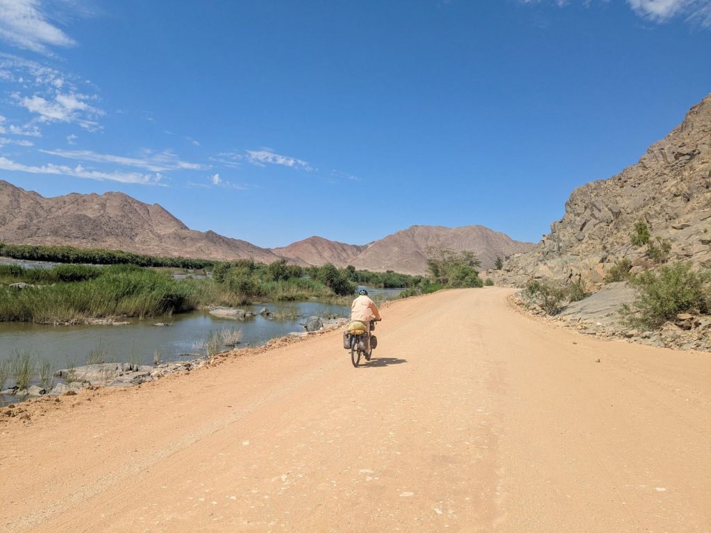 The next morning the trolls (us) scuttle out from under the bridge and heave themselves groaning back into the bikes. The headwind is getting stronger the closer we get to the coast. The road roughly follows the winding river but swoops up and over hills at her leisure. The slate canyon slowly gives way to sand dunes. They start licking at the road and gusts of wind blow sand into our faces. We pass signs on either side of the road saying “Sperrgebiet” (restricted area). We’ve already seen a few diamond mines and they only get more frequent and bigger.